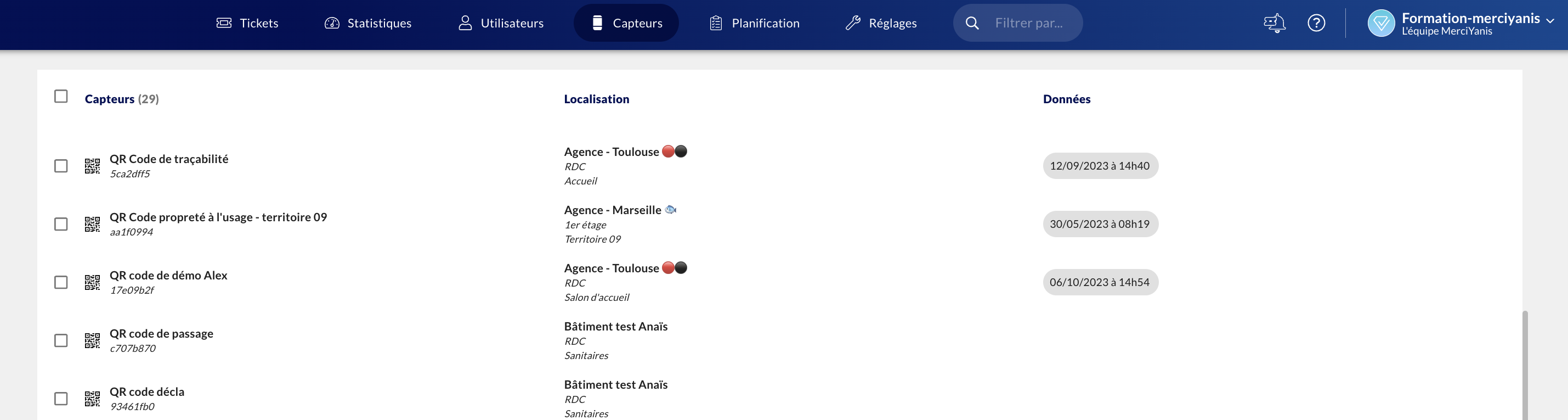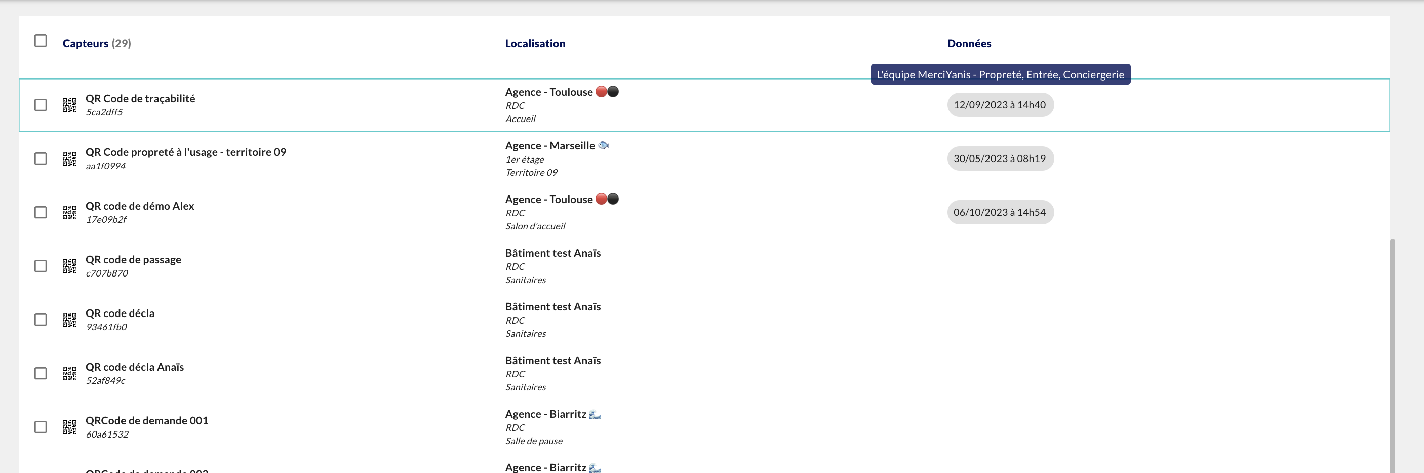 Sur la vue Capteurs pour visualiser rapidement la date du dernier passage sur votre QR code de traçabilité