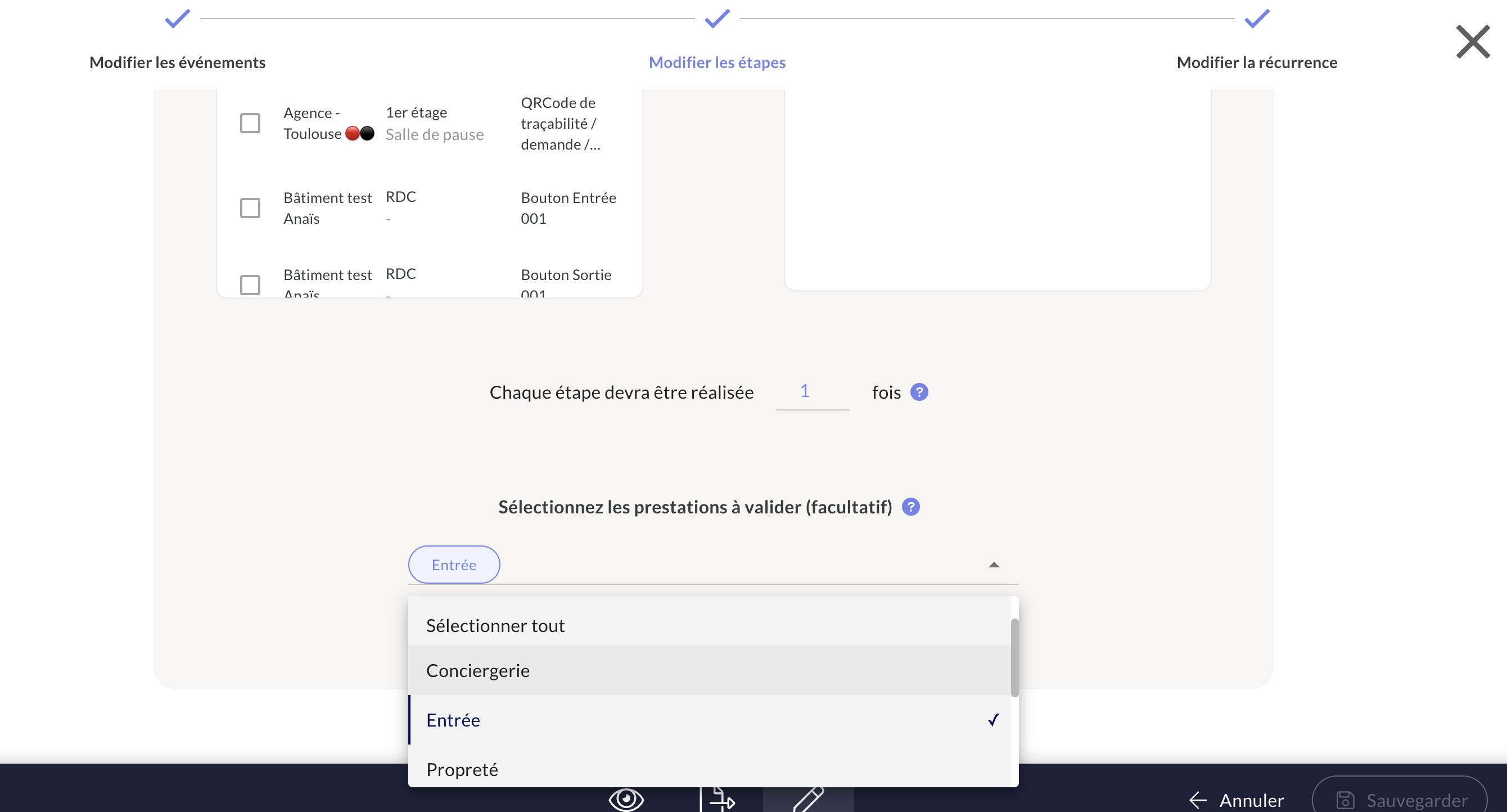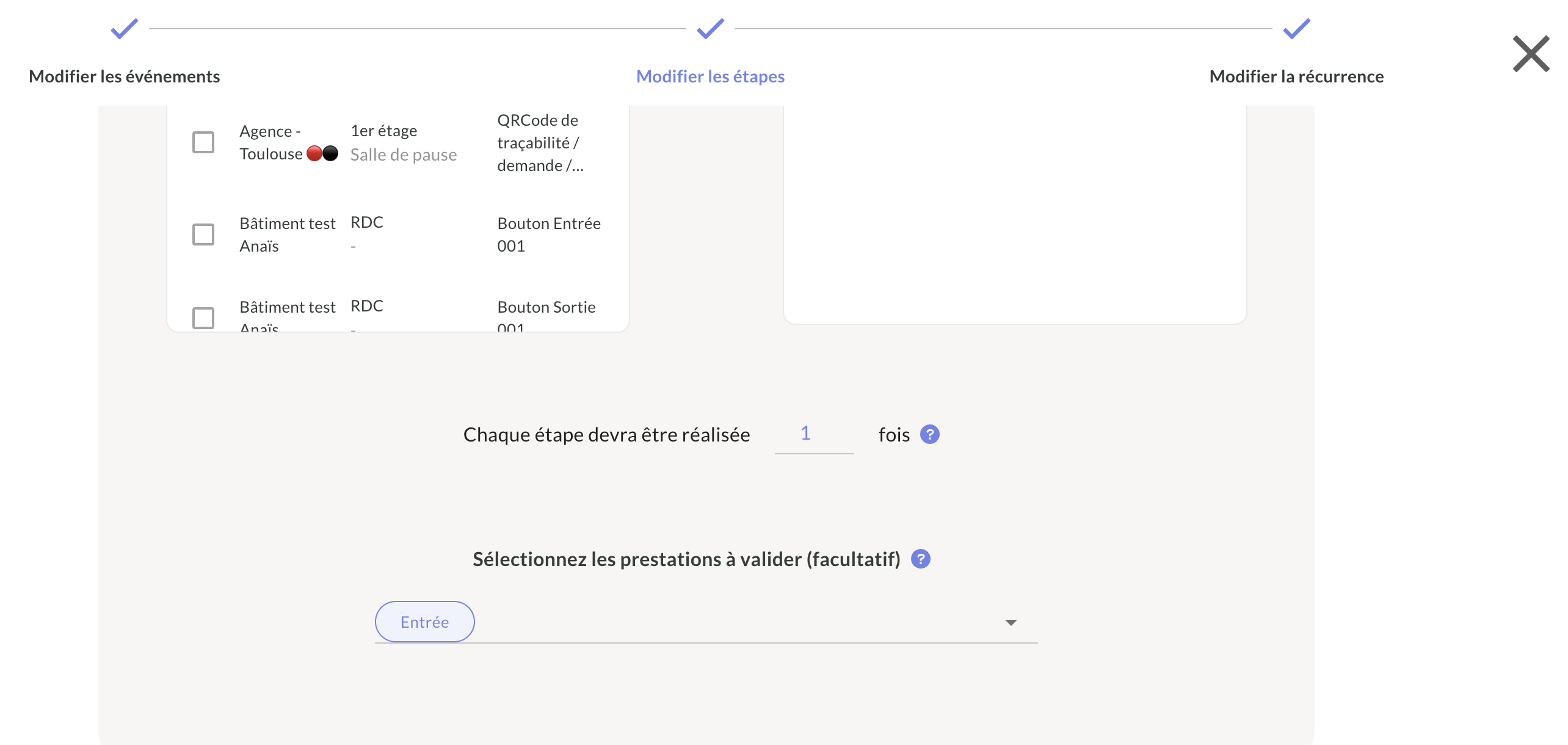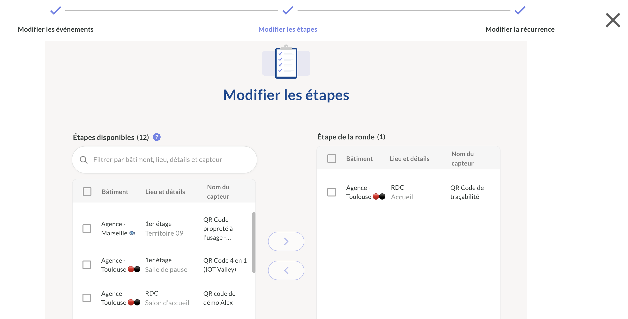 Les étapes correspondent aux capteurs associés à cette ronde : vous pouvez ajouter plusieurs capteurs à valider sur une même ronde si votre agent valide plusieurs prestations à la fois.