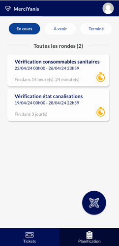 L’interface principale lui permet d’avoir accès à la liste de ses rondes et de pouvoir retrouver le bouton de scan des QR codes dans l’onglet planification.