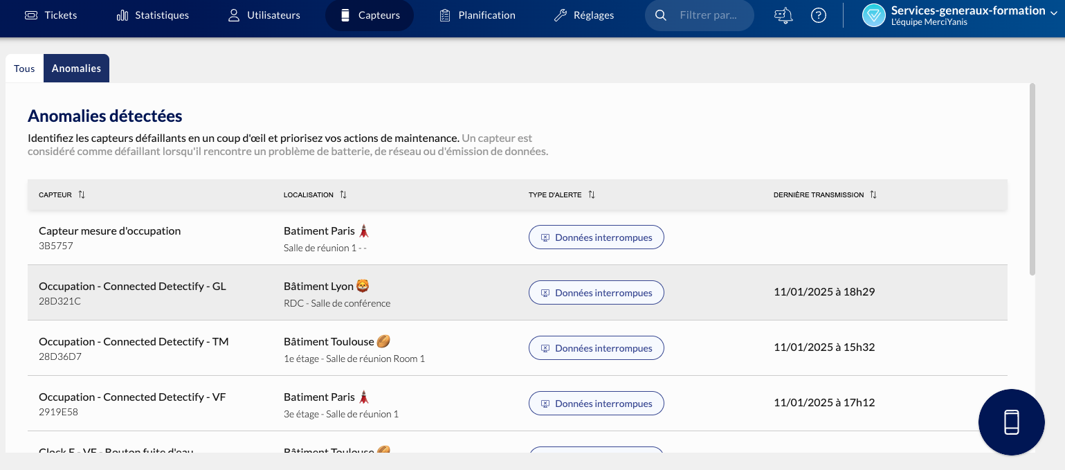 La section Anomalie Capteurs est accessible directement depuis l’onglet Capteurs de l’interface MerciYanis.