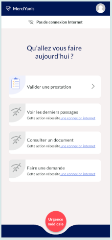Seule l’option “Valider une prestation” est disponible sans réseau. Tout le reste (documents, demandes, historique…) nécessite internet.