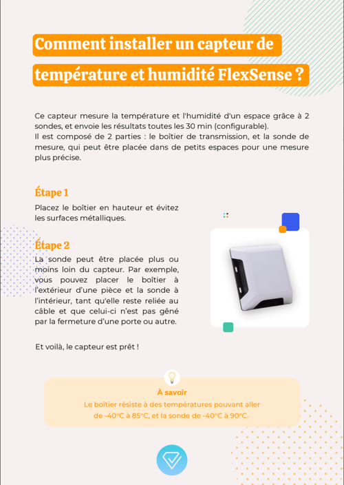 Installer un capteur de température et humidité FlexSense Comment installer un capteur de température et humidité FlexSense ? Retrouvez ces informations dans le .PDF ci-dessous 👇