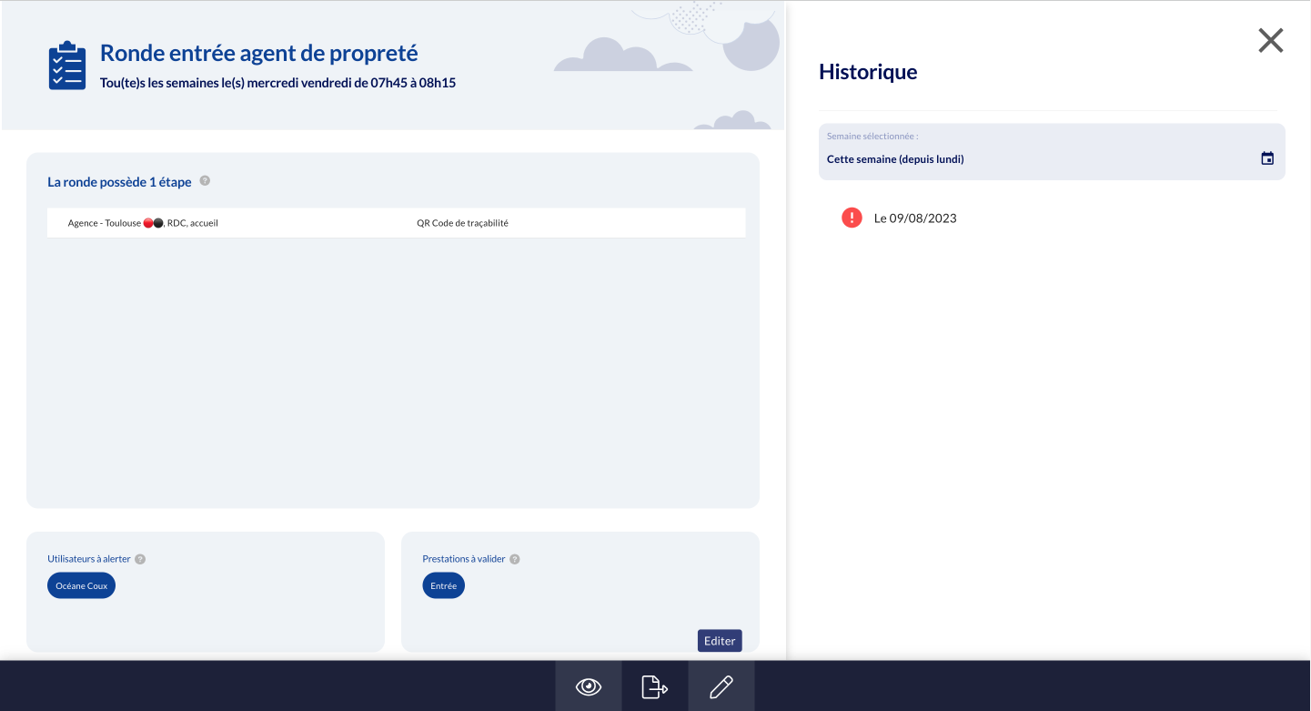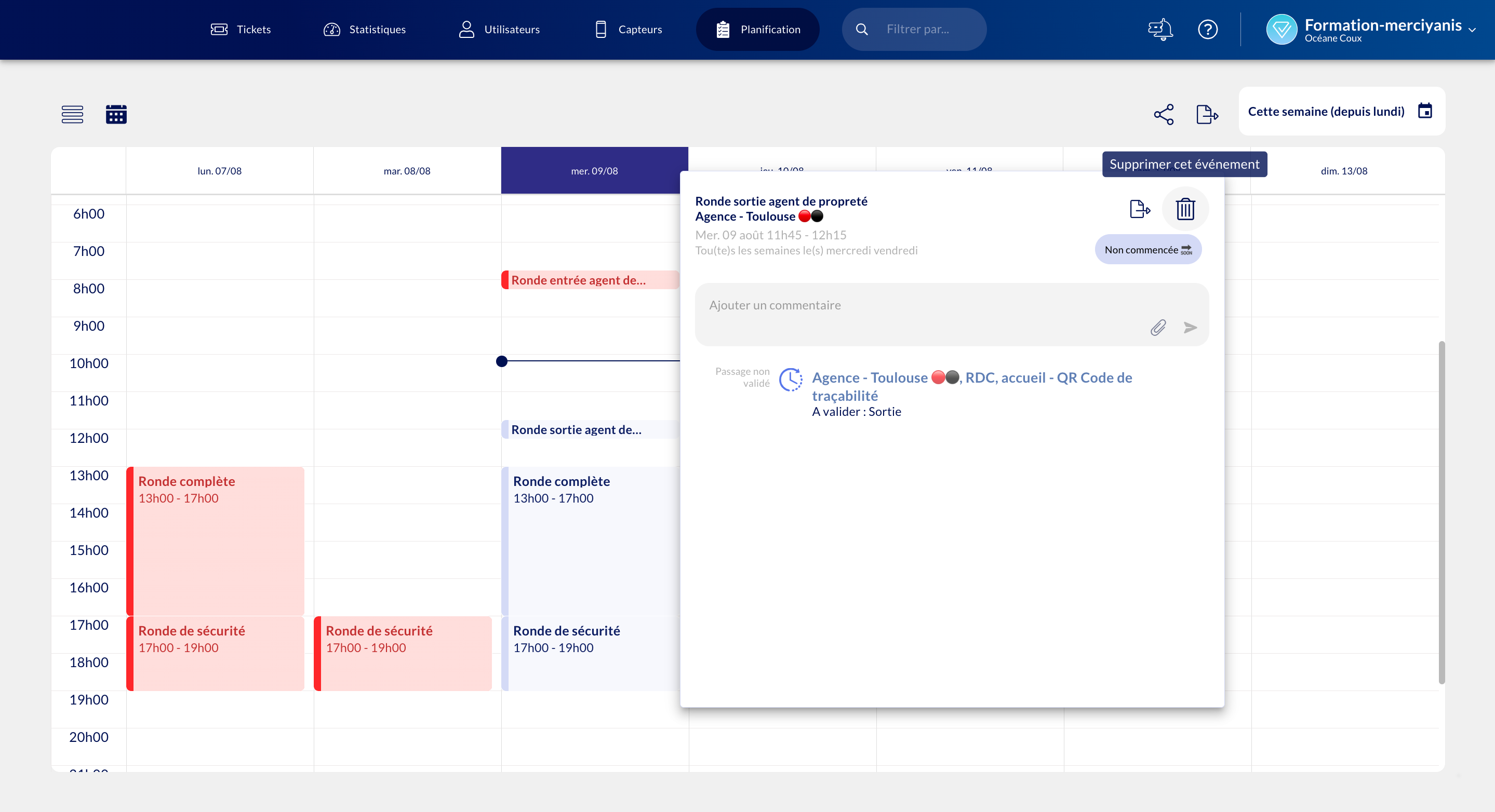→ Si vous souhaitez supprimer cette ronde sur ce jour-là en particulier, vous pouvez cliquer dessus pour ouvrir la fenêtre détaillée et cliquer sur l’icône “poubelle” en haut à droite. De la même manière, la ronde dans sa globalité ne sera pas supprimée, uniquement cette instance.